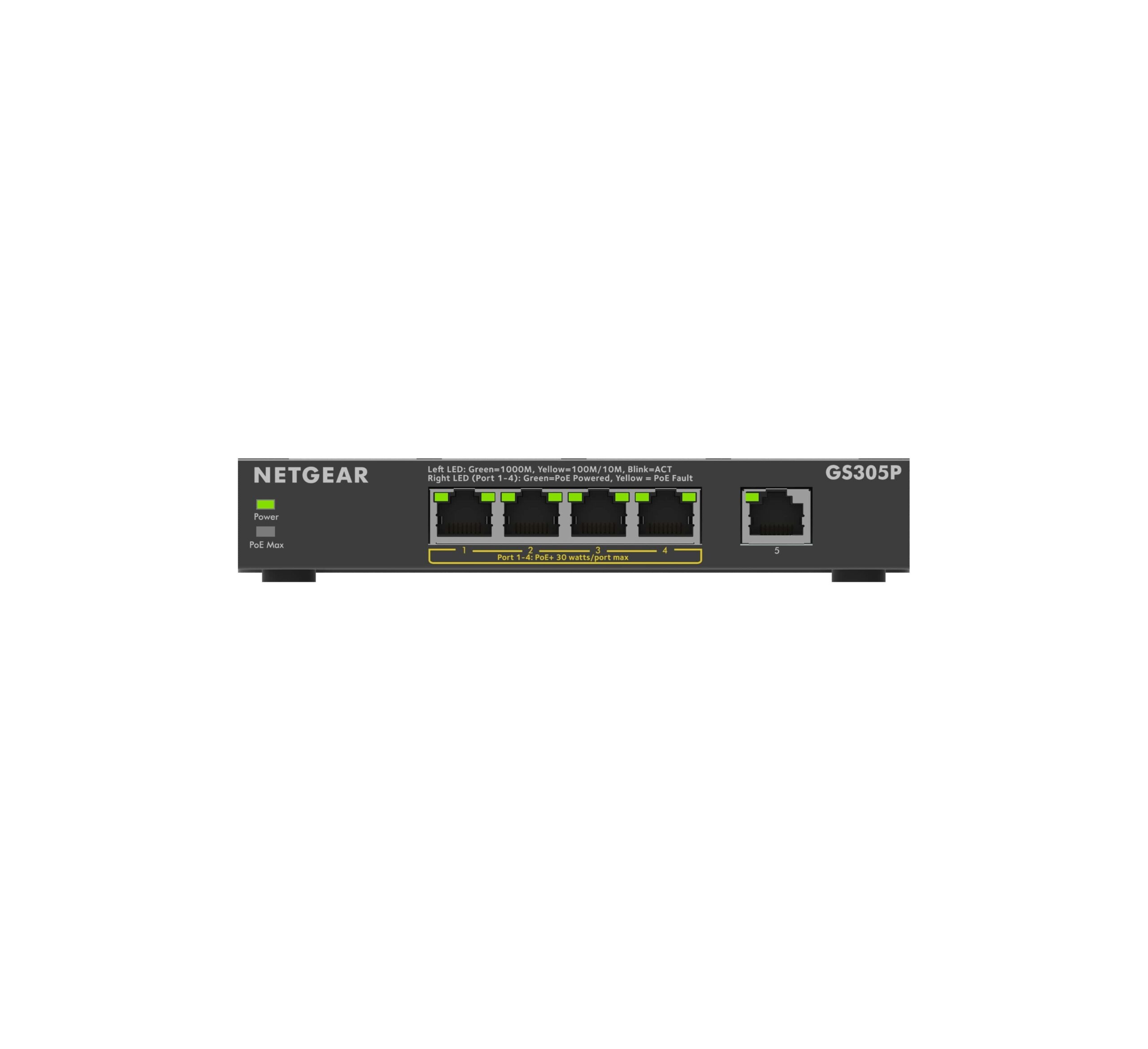 – Speed : 100Mbps/1G- Number of Ports : 5- 4 PoE+ @ 30W each until budget is met- PoE budget : Up to 63W Total- Energy Efficient Ethernet Support (IEEE 802.3az) : Yes- Jumbo frame support : 9,216 bytes- Queue WRR Ratio : 1:2:4:8- MAC table size : 2k- Packet buffer size : 128KB- IEEE 802.1p QoS : Yes- Power Consumption (Max/Standby) : 66.78W/1.02W- Operating Temperature : 0-40°C (32°F – 104°F)- MTBF (hours) : 4,113,947 hrs (469.32 years)- FCC Class : Class B- Fans : 0- Acoustic Noise Level @25C : Fanless